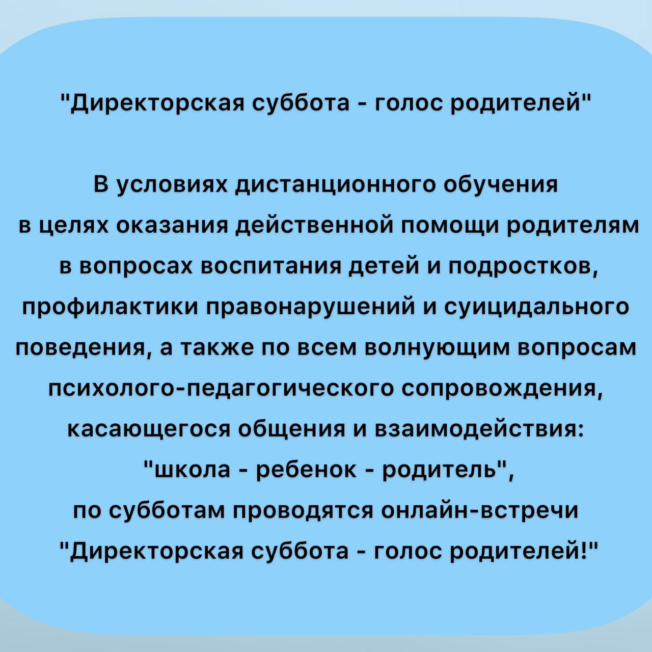 В условиях дистанционного обучения в целях оказания действенной помощи родителям в вопросах воспитания детей и подростков, профилактики правонарушений и суицидального поведения, а также по всем волнующим вопросам психолого-педагогического сопровождения, касающегося общения и взаимодействия: "школа - ребенок - родитель", по субботам проводятся онлайн-встречи "Директорская суббота - голос родителей!"