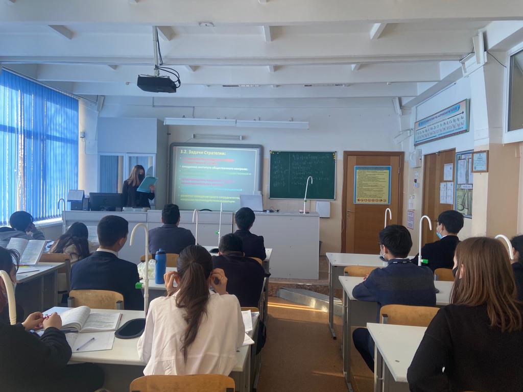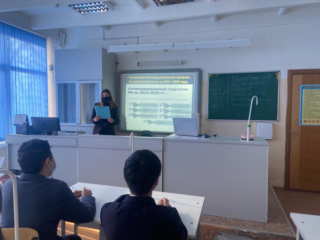 Социальный педагог КГУ ОШ 116 Варис М.Х. 10 февраля 2022г. провела открытый урок с учащимися 10-х классов на тему: «Основы общественного порядка!». Целью данного мероприятия является: формирование правовой культуры и правового сознания, воспитывать чувство ответственности перед своим государством. Основная задача- сформировать четкую гражданскую позицию, основывающуюся на противостоянии коррупции.