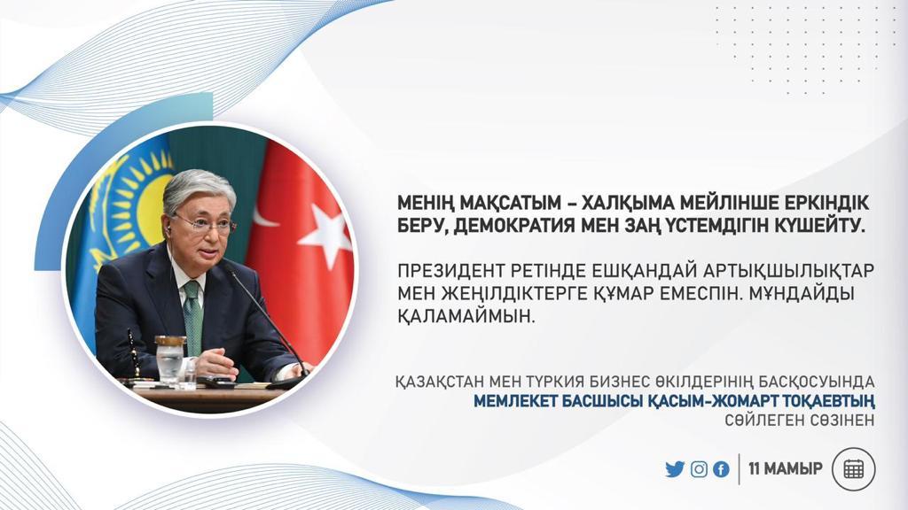 11 май 2022 0 1 2 3 4 5 Мемлекет басшысы Қасым-Жомарт Тоқаевтың сөйлеген сөзінен Қазақстан мен Түркия бизнес өкілдерінің басқосуында Мемлекет басшысы Қасым-Жомарт Тоқаевтың сөйлеген сөзінен Осы беттің QR-коды:QR-код этой страницы: