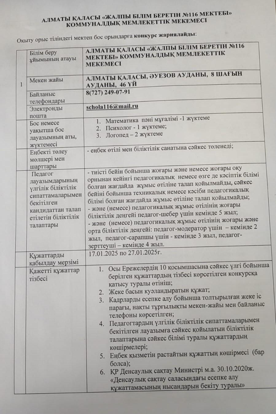 17 январь 2025 0 1 2 3 4 5 Оқыту орыс тіліндегі мектеп бос орындарға конкурс жариялайды/ Объявляет конкурс на вакантные должности с русским языком обучения Осы беттің QR-коды:QR-код этой страницы:
