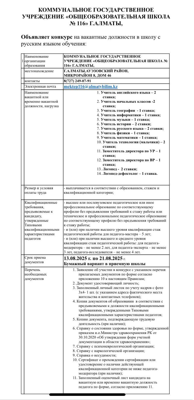 13 август 2025 0 1 2 3 4 5 Объявляет конкурс на вакантные должности в школу с русским языком обучения: Осы беттің QR-коды:QR-код этой страницы: