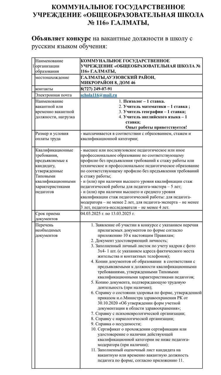 Оқыту орыс тіліндегі мектеп бос орындарға конкурс жариялайды/Объявляет конкурс на вакантные должности в школу с русским языком обучения