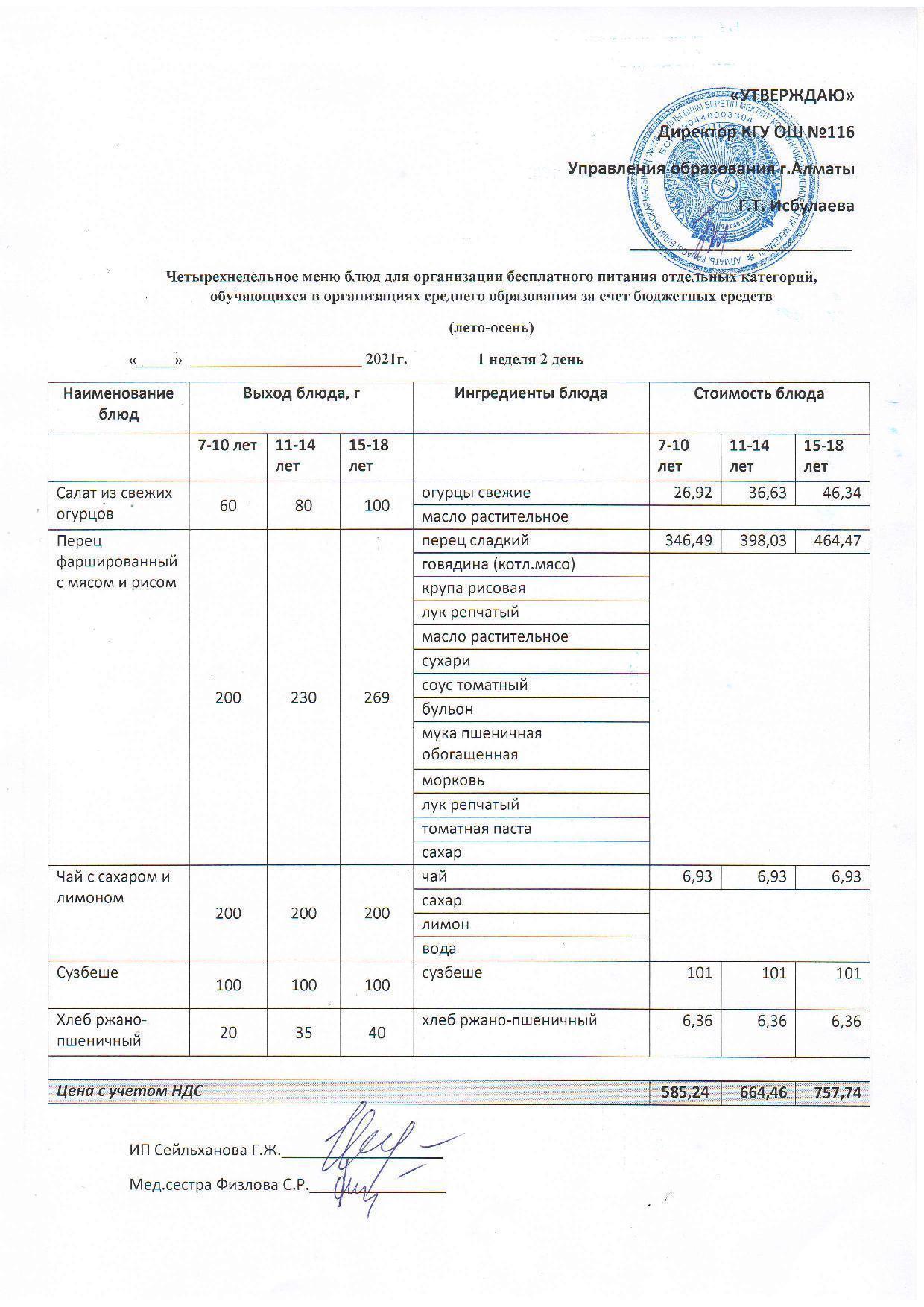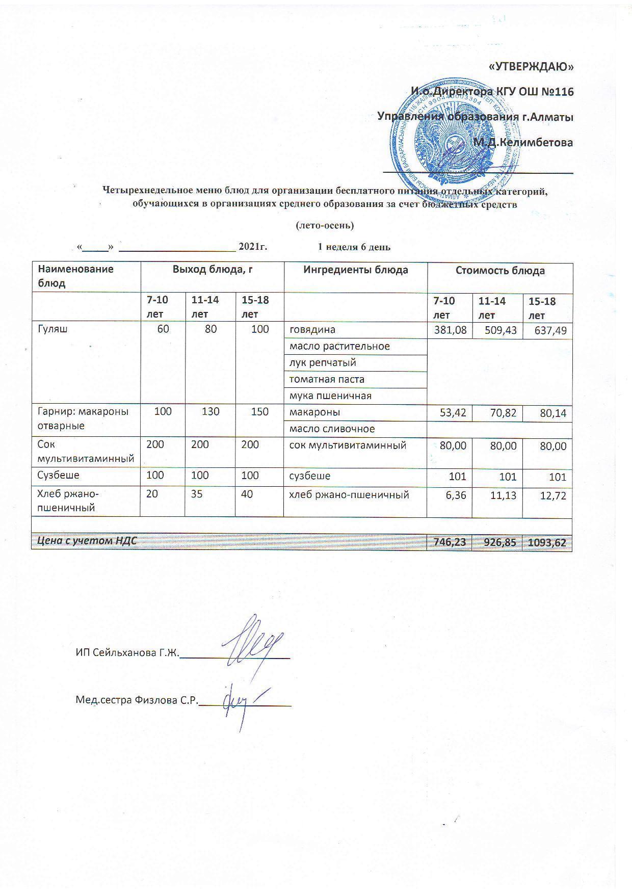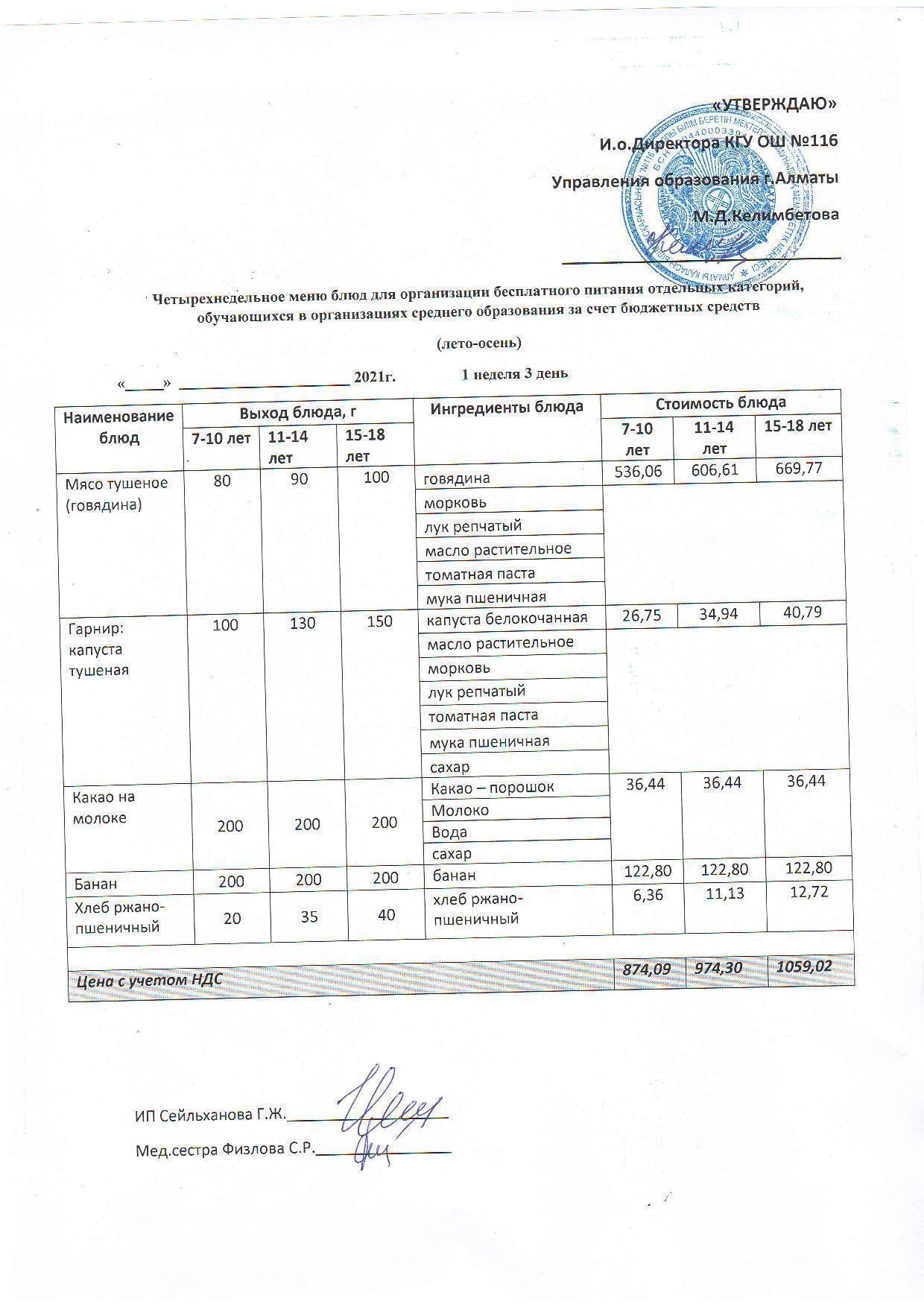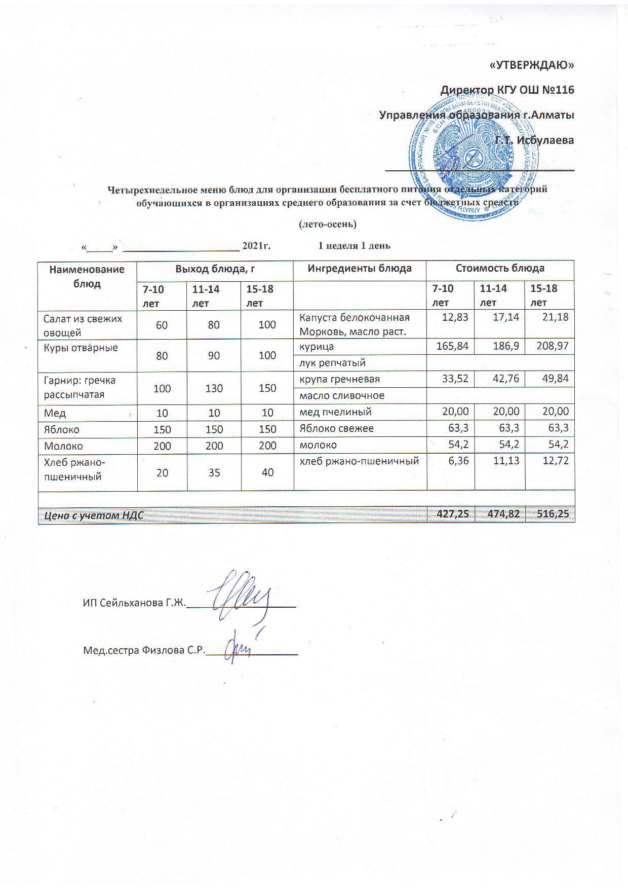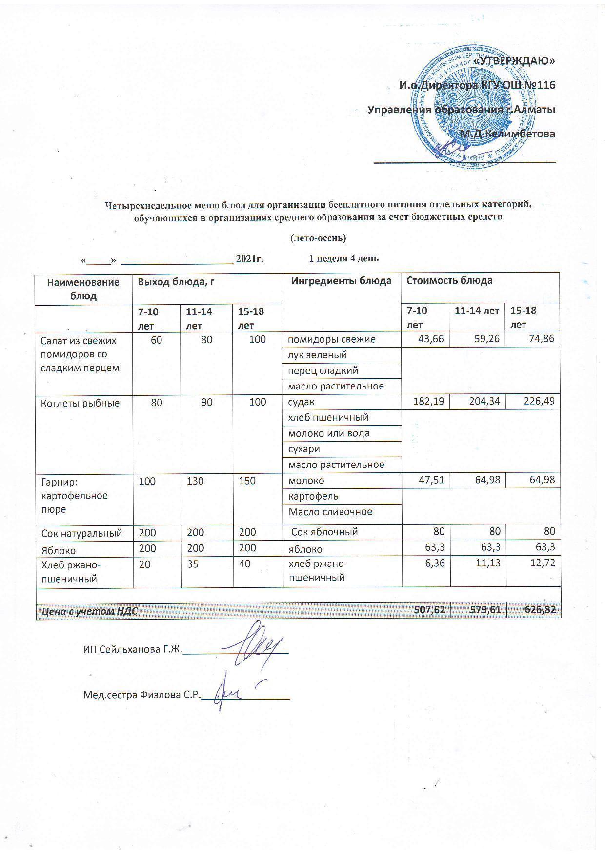 Меню блюд для организации бесплатного питания отдельных категории, обучающихся в оргнаизациях среднего образования за счет бюджетных средств