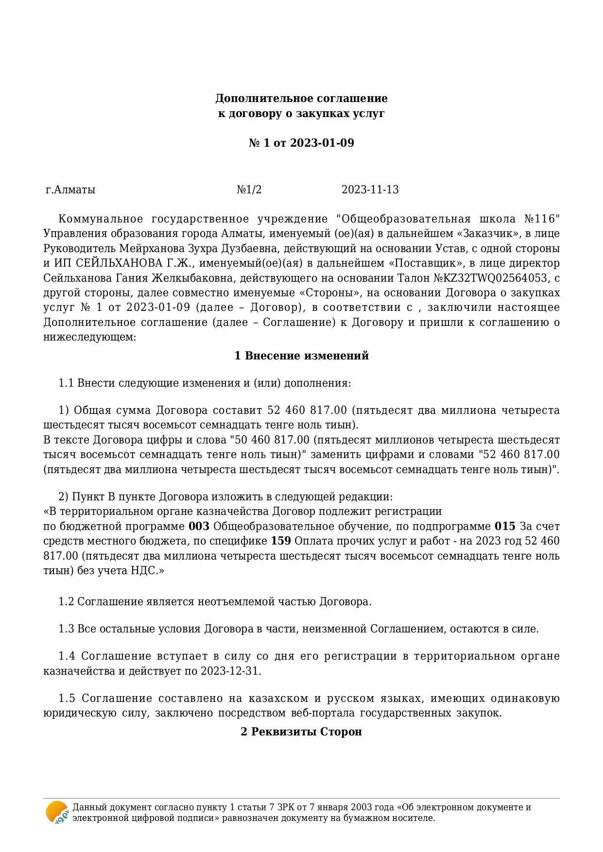 01 сентябрь 2023 0 1 2 3 4 5 Көрсетілетін қызметтерді сатып алу туралы шартына қосымша келісім 1/Дополнительное соглашение к договору о закупках услуг 1. 1-4 класс Осы беттің QR-коды:QR-код этой страницы:
